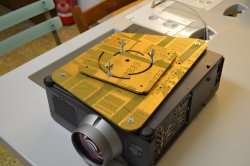 Die untere Platte ist über vier Schrauben direkt mit dem Beamer verschraubt. Die beiden Platten sind über drei lange Schrauben miteinander verbunden. In der unteren Platte sind die drei Schrauben fixiert. In der oberen Platte sind drei Drittelkreis- Schlitze so angeordnet dass sie um diese drei Schrauben ca. 120 Grad gedreht werden kann. Die obere Platte wiederum ist über vier Schnüre an Haken in der Decke aufgehängt.