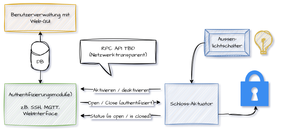 Nach meiner Vorstellung handelt es sich dabei um Software. Die Software wird spezifisch auf die Gegebenheiten eines ganz bestimmten physikalischen Schlosses angepasst. Schloss-Aktuatoren sollen austauschbar sein. Das heisst, die interne Architektur sieht eine einheitliche Schnittstelle vor, über welche die Schloss-Aktuatoren mit dem Authentifizierungsmodul kommunizieren.